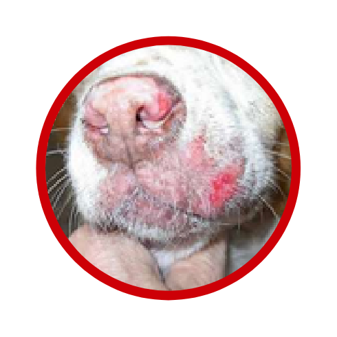 La aparición de los síntomas es tardía, por lo que muchas veces al detectarla ya es imposible el tratamiento, provocando la muerte. Los principales síntomas se ven en la piel, con heridas sin explicación, nódulos hinchados por debajo de la piel, costras y perdida de uñas. También los problemas en los ojos son frecuentes.
